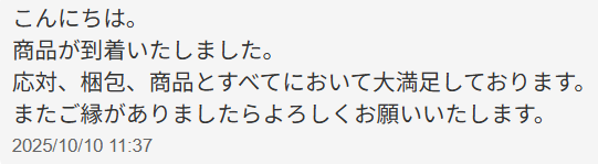 【お客様のお声No.204【こんにちは。商品が到着いたしました。対応、梱包、商品とすべてにおいて大満足しております。またご縁がありましたらよろしくお願いいたします。】