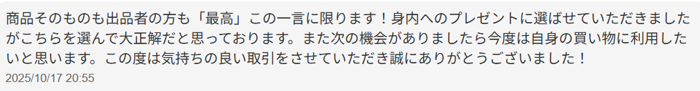 お客様のお声No.206【商品そのものも出品者の方も「最高」この一言に限ります!身内へのプレゼントに選ばせていただきましたがこちらを選んで大正解だと思っております。また次の機会があり・・・】
