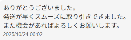お客様のお声No.210【ありがとうございました。発送が早くスムーズに取り引きできました。また機会があればよろしくお願いします。】