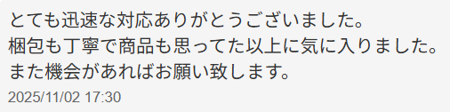 お客様のお声No.211【とても迅速な対応ありがとうございました。梱包も丁寧で商品も思ってた上に気に入りました。また機会があればお願い致します。】