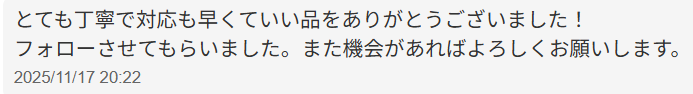 お客様のお声No.214【とても丁寧で対応も早くていい品をありがとうございました!フォローさせてもらいました。また機会があればよろしくお願いします。】