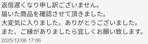 お客様のお声No.217【返信遅くなり申し訳ございません。届いた商品を確認させて頂きました。大変気に入りました。ありがとうございました。また、ご縁がありましたら宜しくお願い致します。】