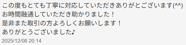 お客様のお声No.219【この度もとても丁寧に対応していただきありがとうございます(^^)お時間融通していただき助かりました!是非また取引の方よろしくお願いします!ありがとうございました♪】