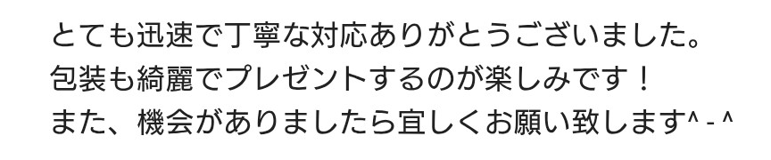 お客様のお声No.221【とても迅速で丁寧な対応ありがとうございました。包装も綺麗でプレゼントするのが楽しみです!また、機会がありましたら宜しくお願い致します^-^】