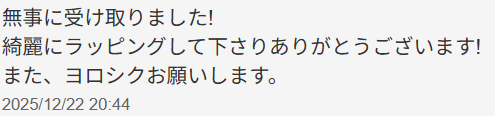 お客様のお声No.224【無事に受け取りました!綺麗にラッピングして下さりありがとうございます!また、ヨロシクお願いします。】2025/12/22 20:44