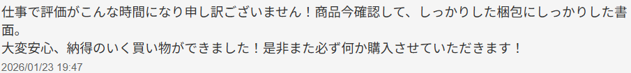 お客様のお声No.236【~商品今確認して、しっかりした梱包にしっかりした書面。大変安心、納得のいく買い物ができました!是非また必ず何か購入させていただきます!】