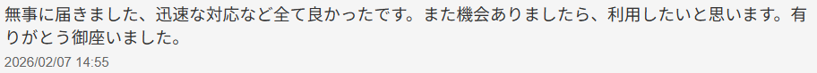 お客様のお声No.242【無事に届きました、迅速な対応など全て良かったです。また機会ありましたら、利用したいと思います。有りがとう御座いました。】