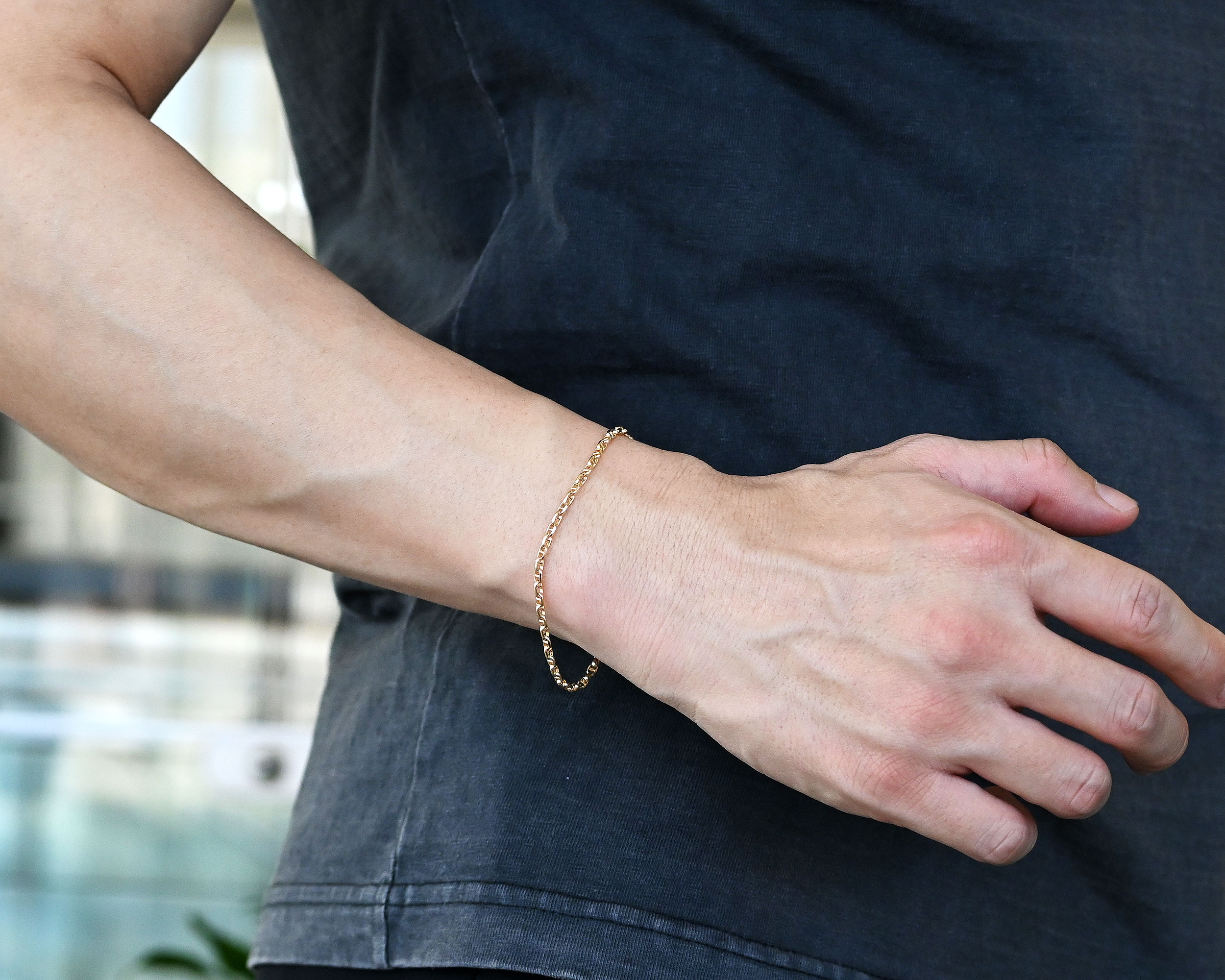 船を停泊させる際に海底に沈めるイカリにつける鎖をもとにつくられたアンカーチェーン。ファッション性の高いK18ブレスレットですので華やかな印象になります。