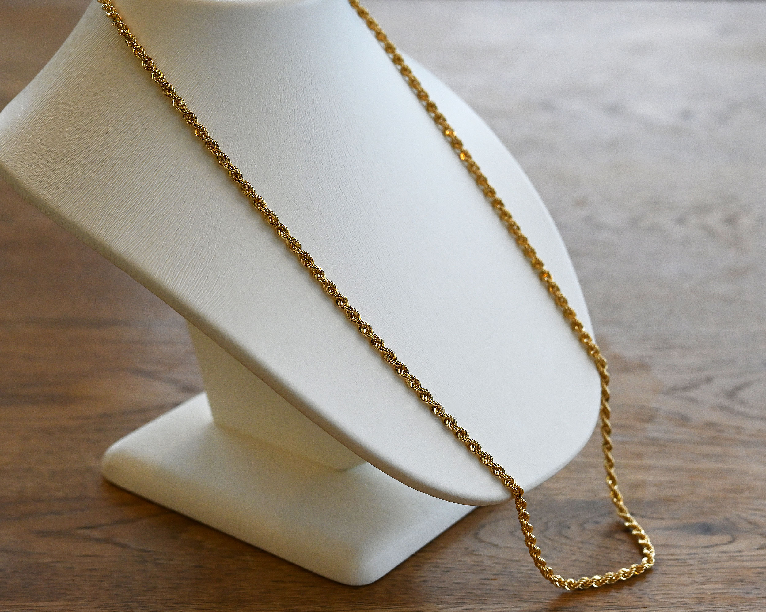 縄状にデザインされたパイプロープチェーンは、その入り組んだデザインにより光の反射が良く、K18の輝きを存分にお楽しみ頂けます。ボリュームを楽しみたい場合にはこちらの3mmがおすすめです。長さは45cm 50cm 60cmの展開でご用意しております。