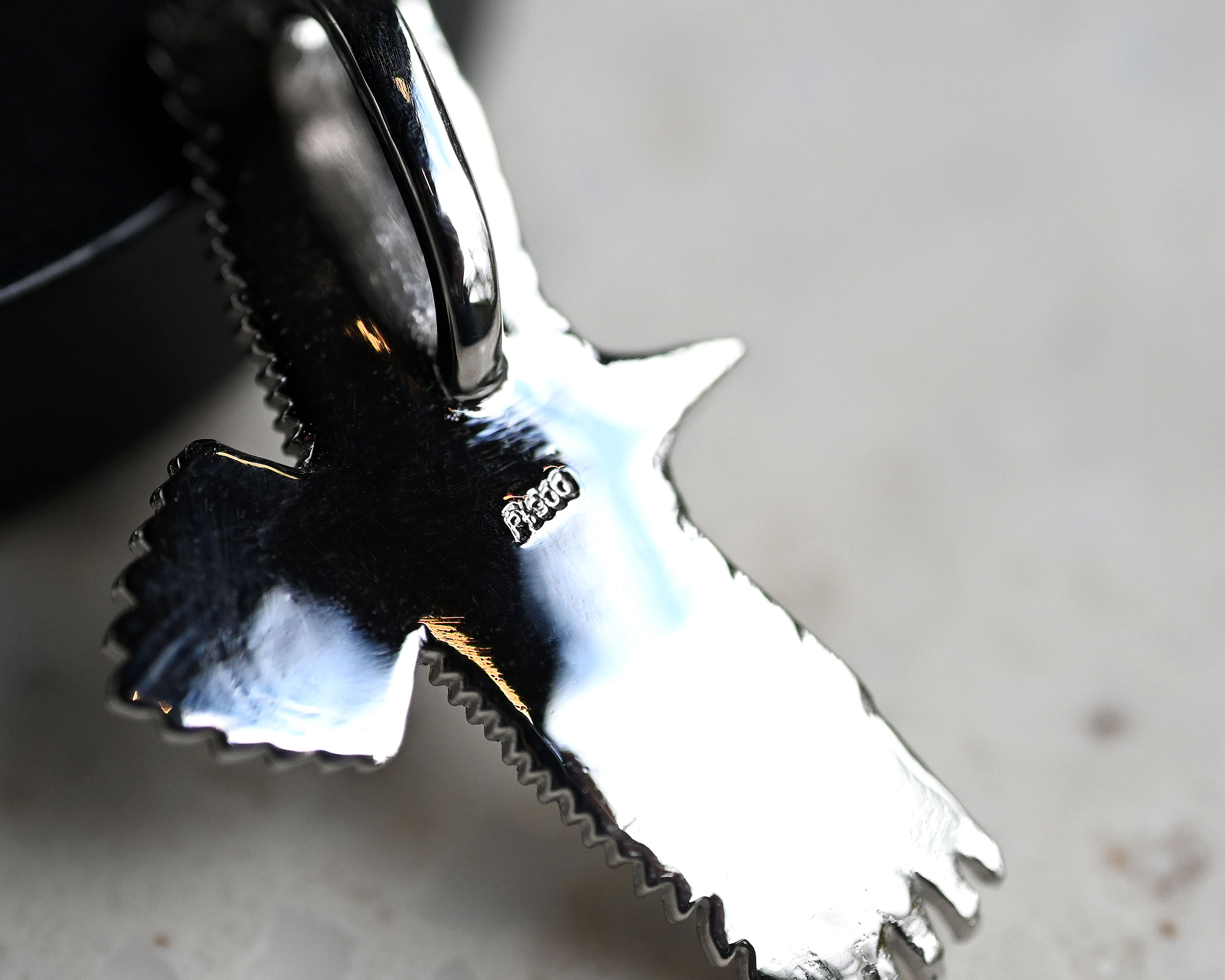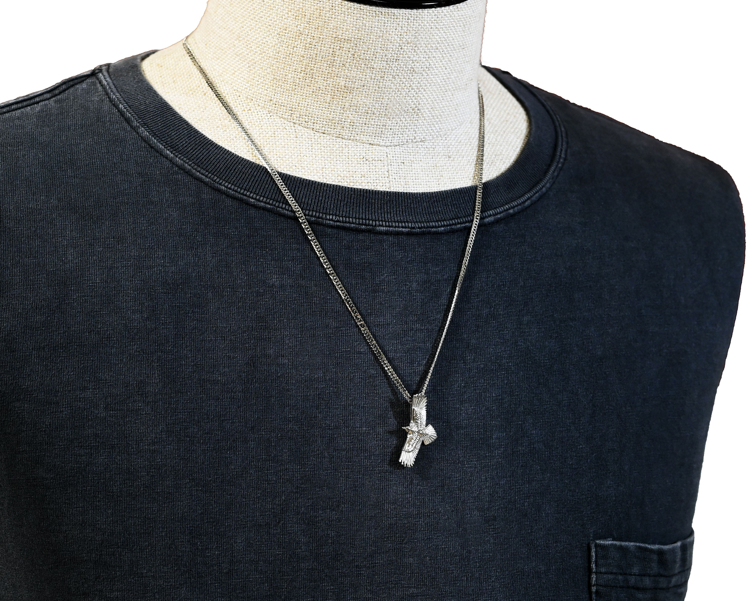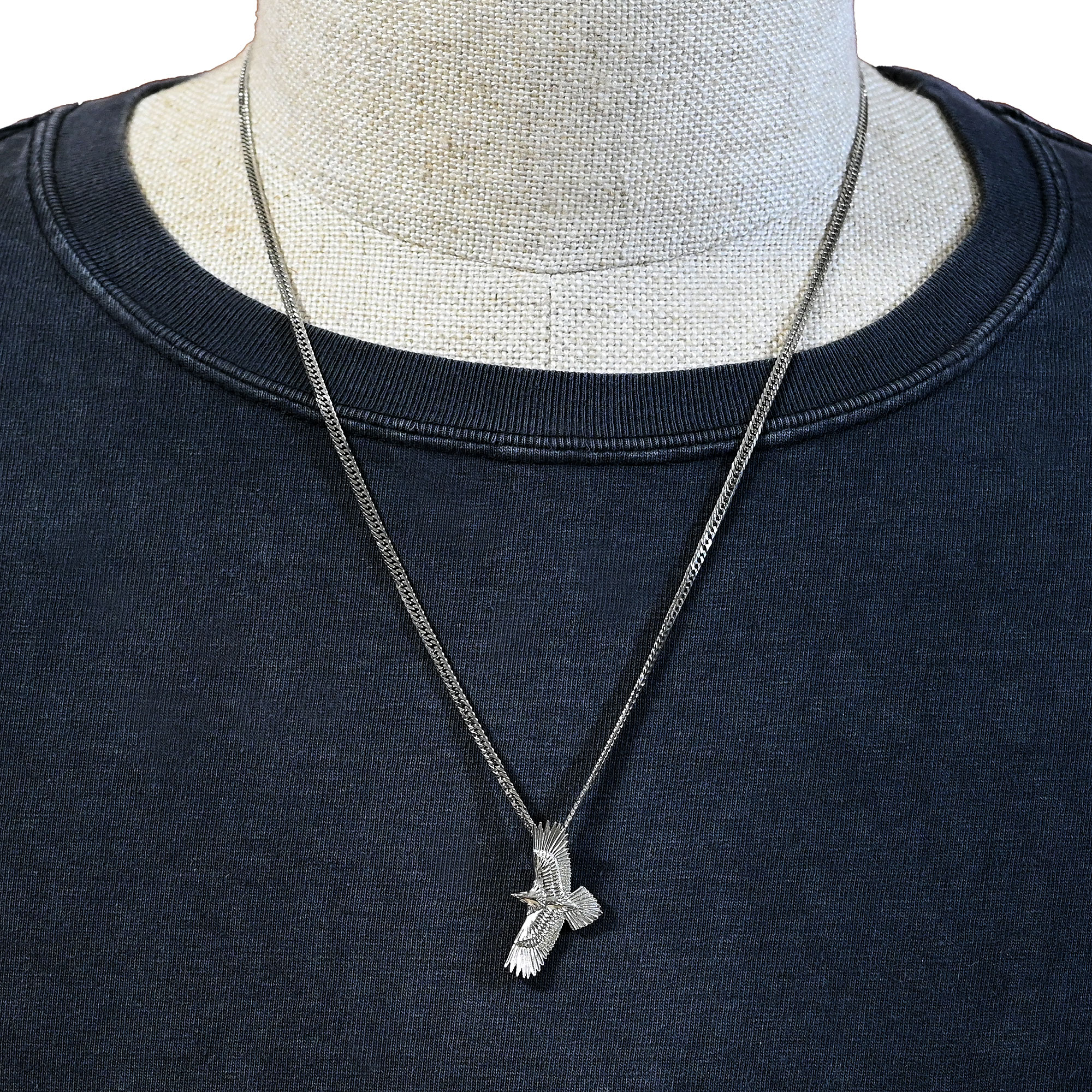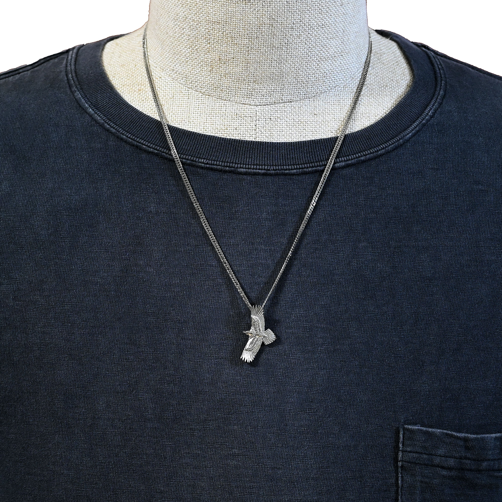 大空を自由に舞うイーグルを贅沢にPt900プラチナで表現しています。横向きイーグルペンダントはコーディネートしやすくスタイリッシュにお楽しみ頂けます。