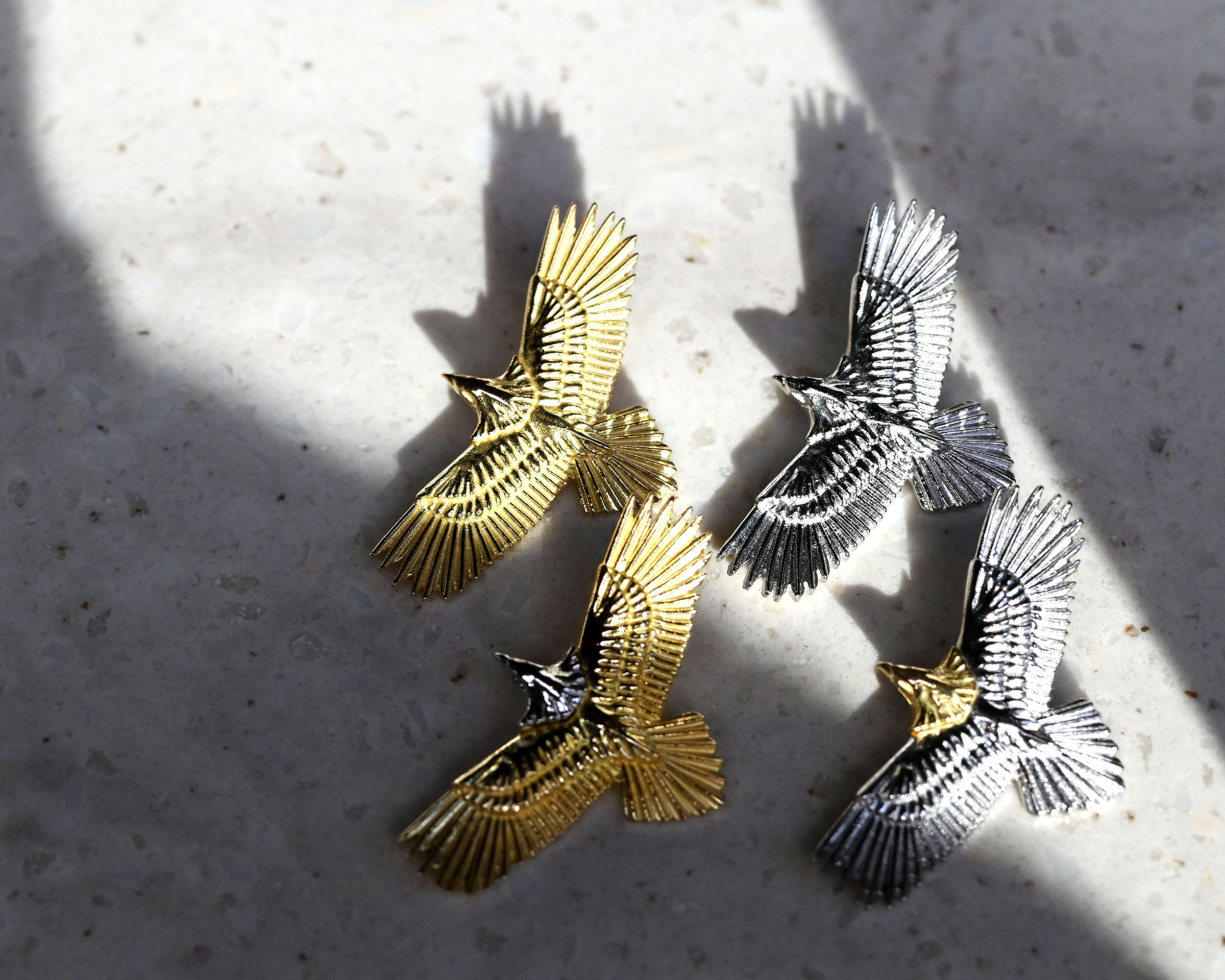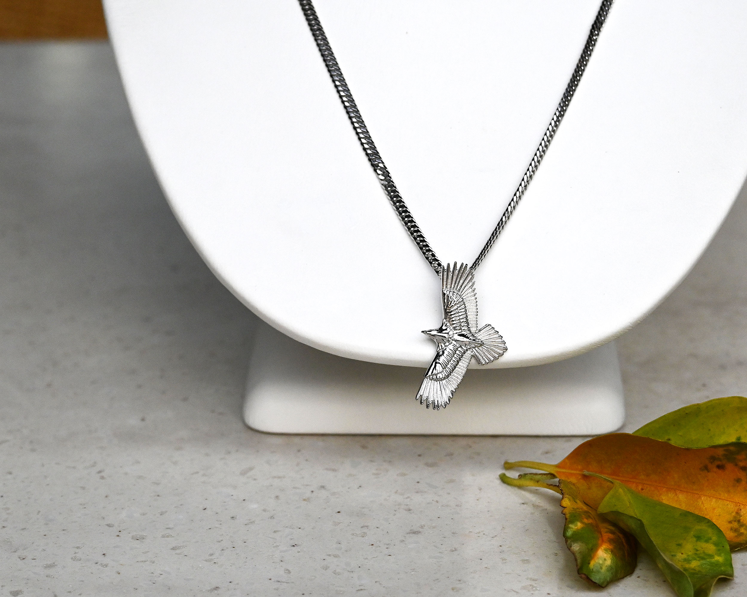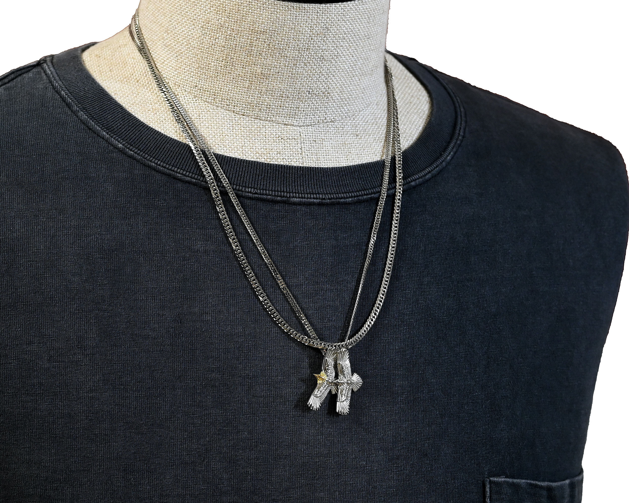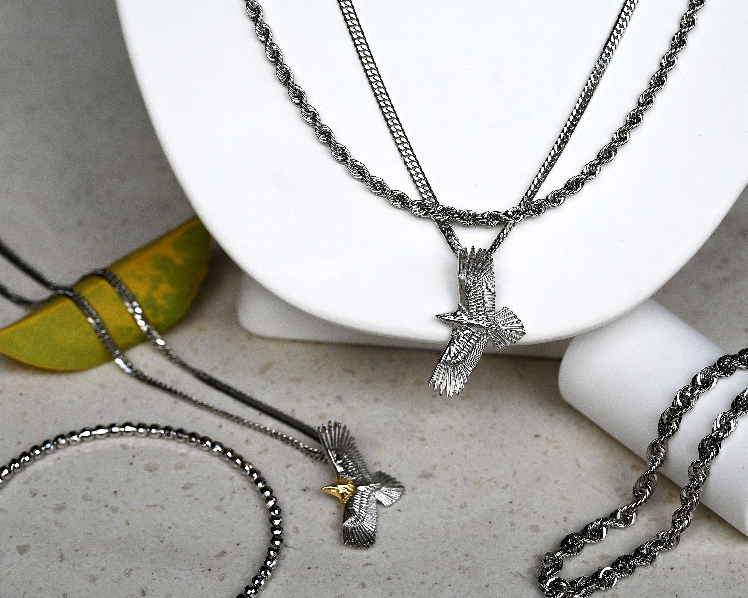 大空を自由に舞うイーグルを贅沢にPt900プラチナで表現しています。横向きイーグルペンダントはコーディネートしやすくスタイリッシュにお楽しみ頂けます。