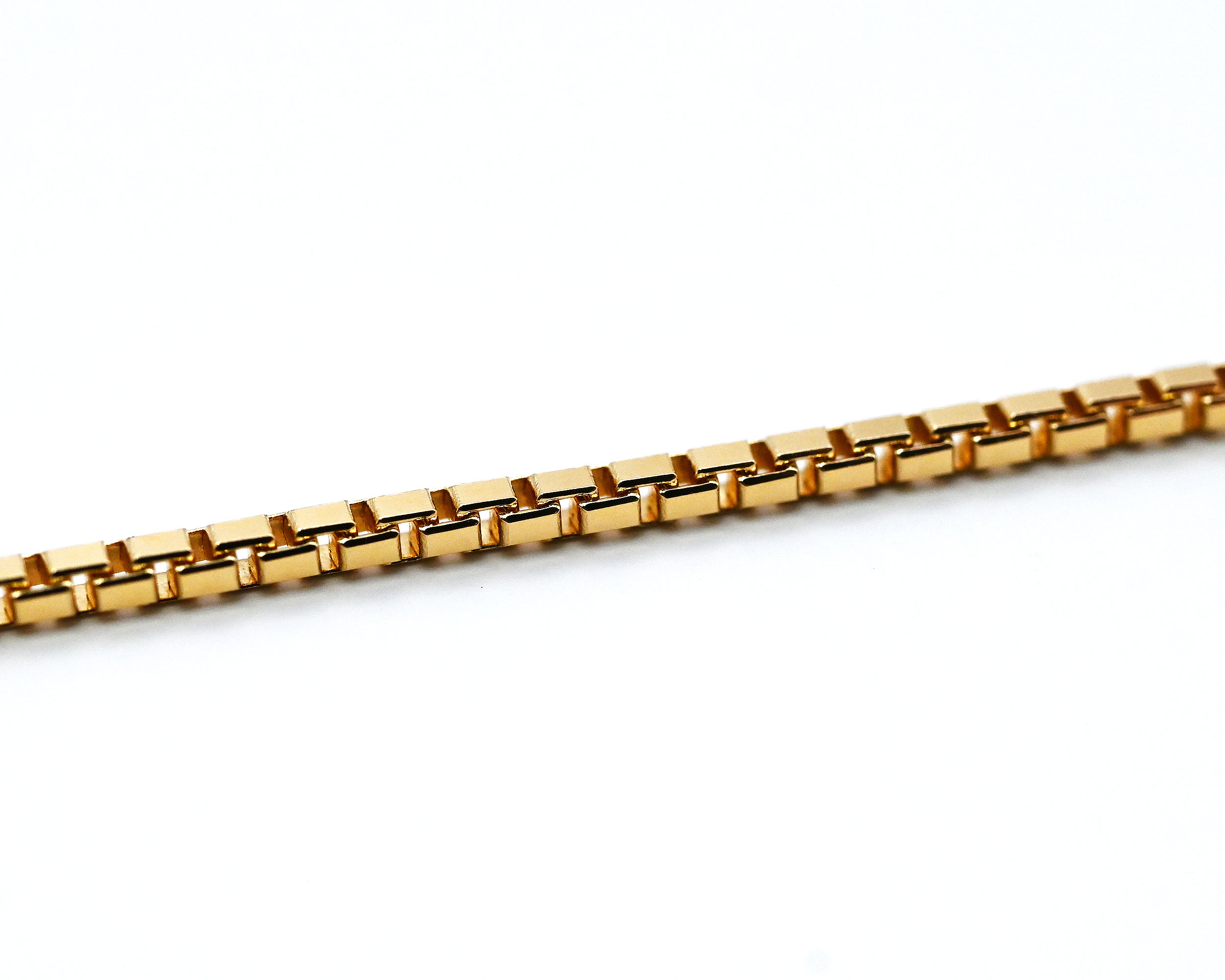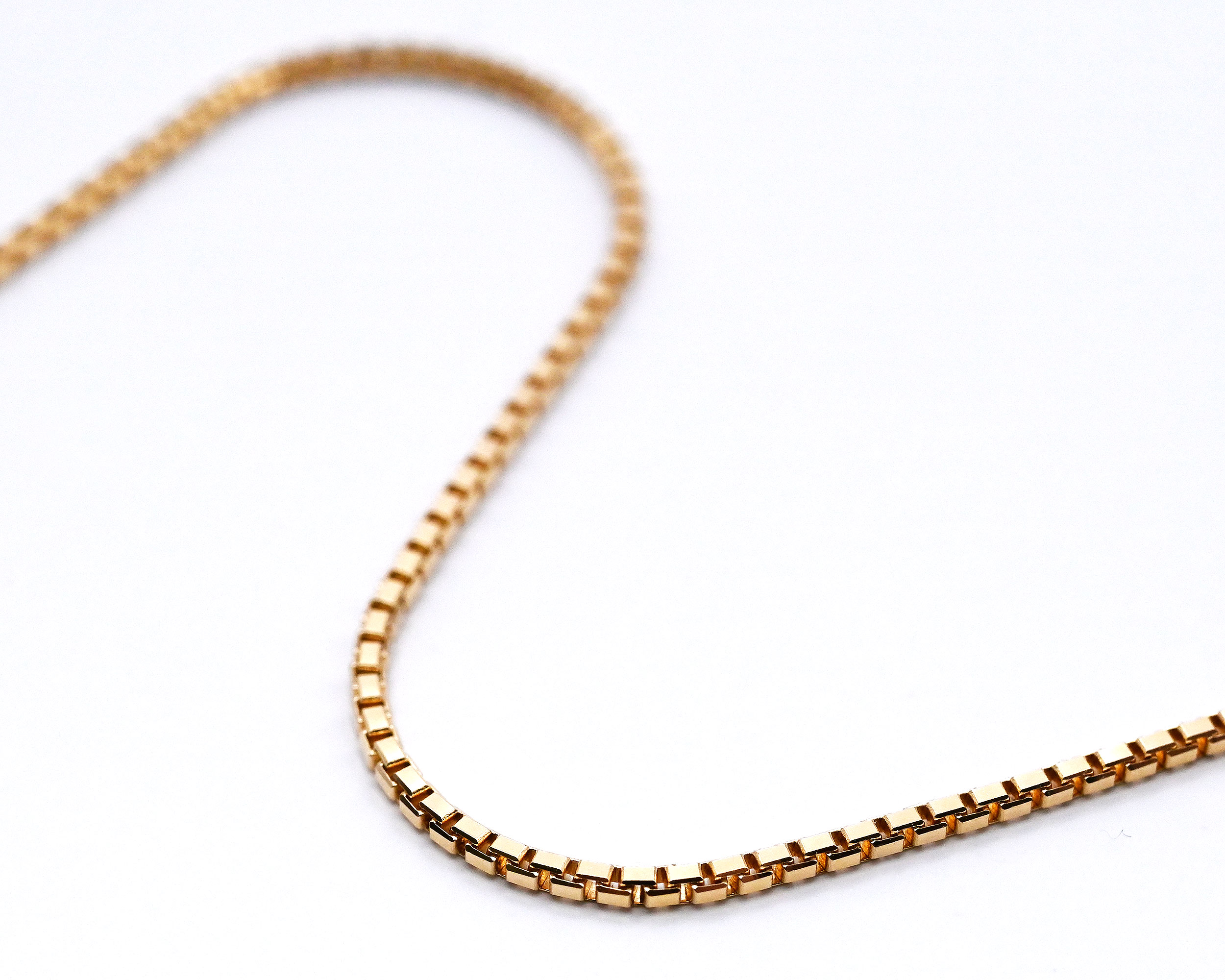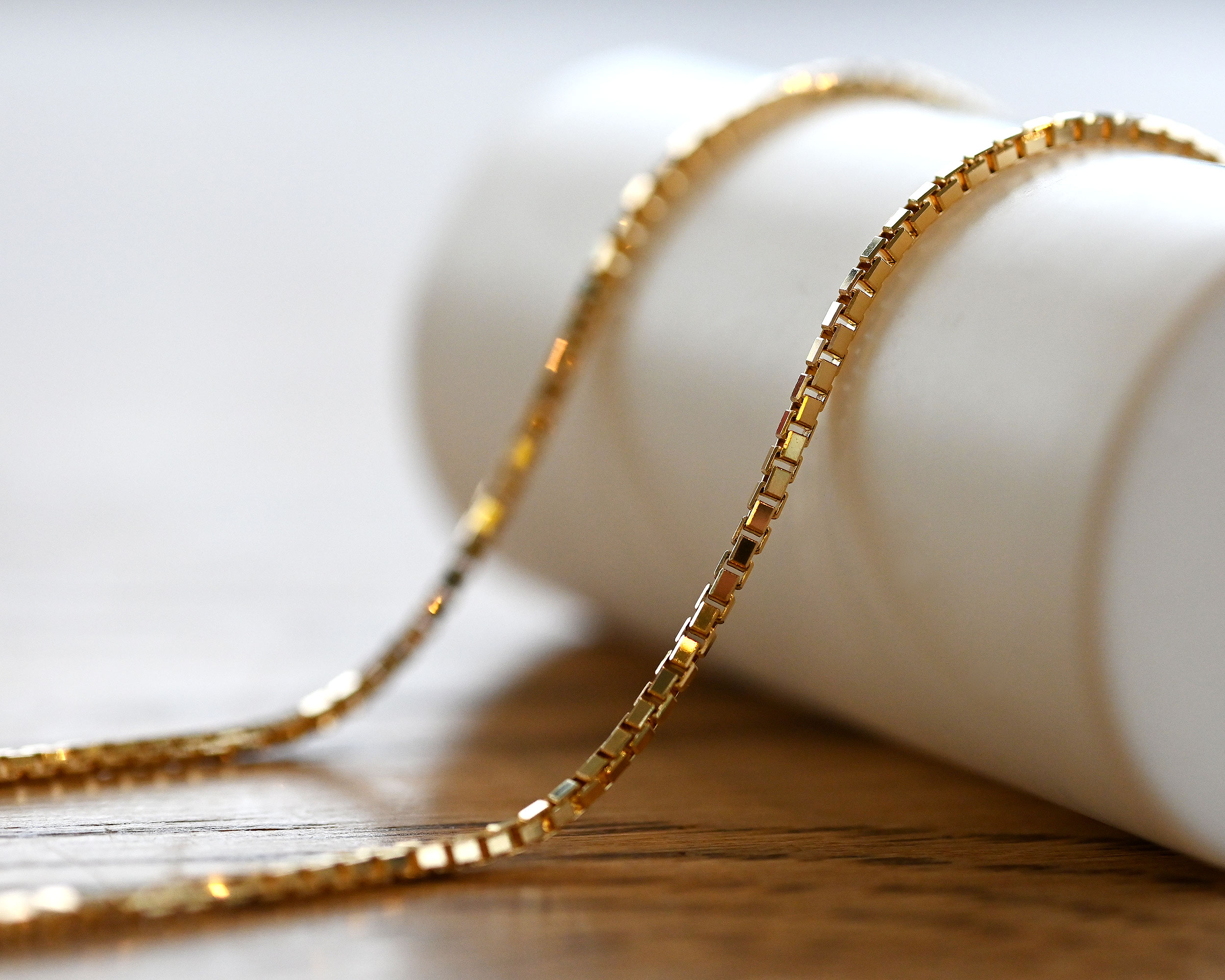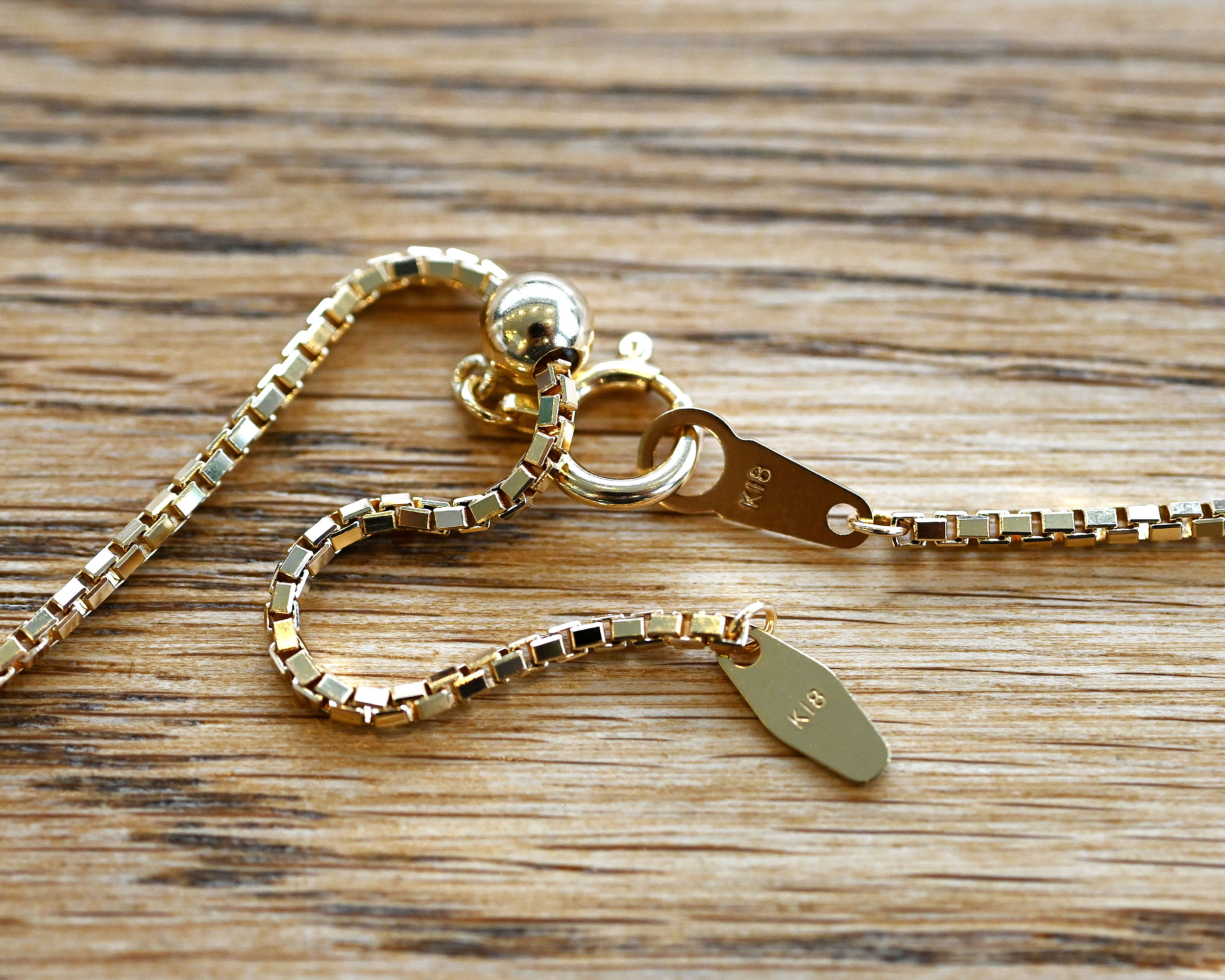 ボックス型のコマを組み合わせたクラシカルなベネチアチェーン。しなやかで密度のあるチェーンは滑らかな光沢と繊細な存在感が魅力。