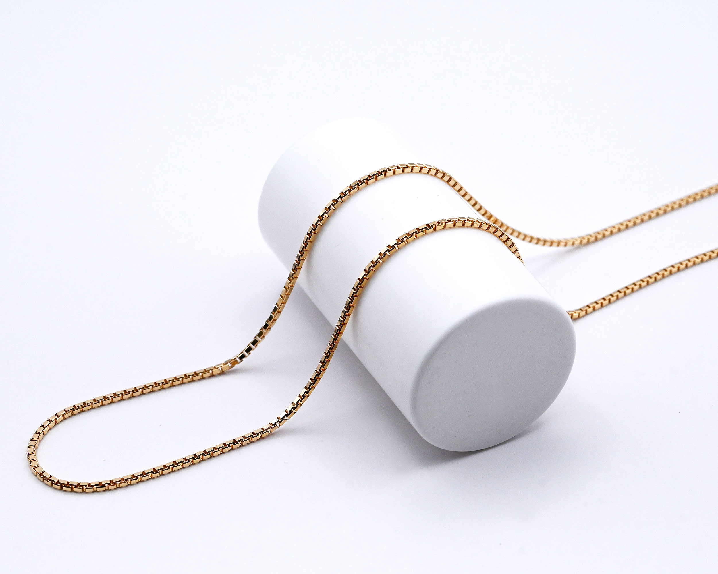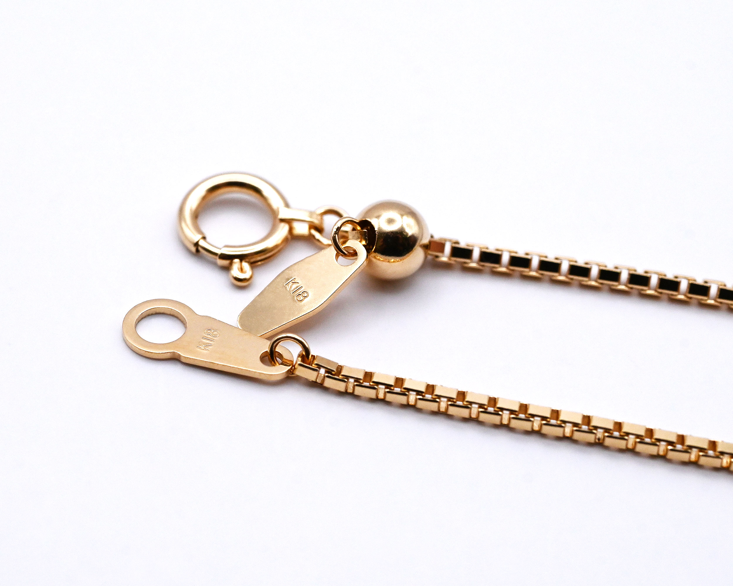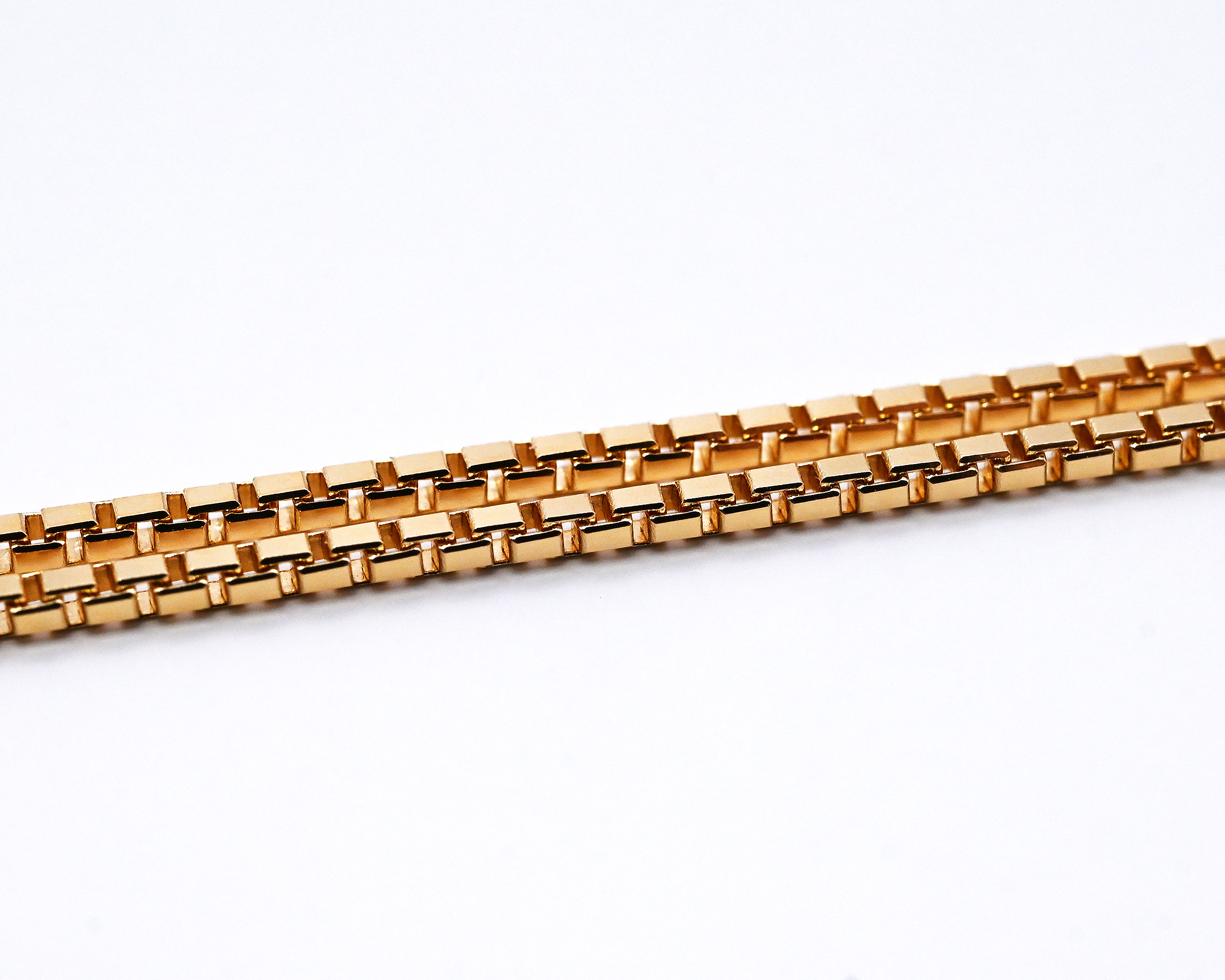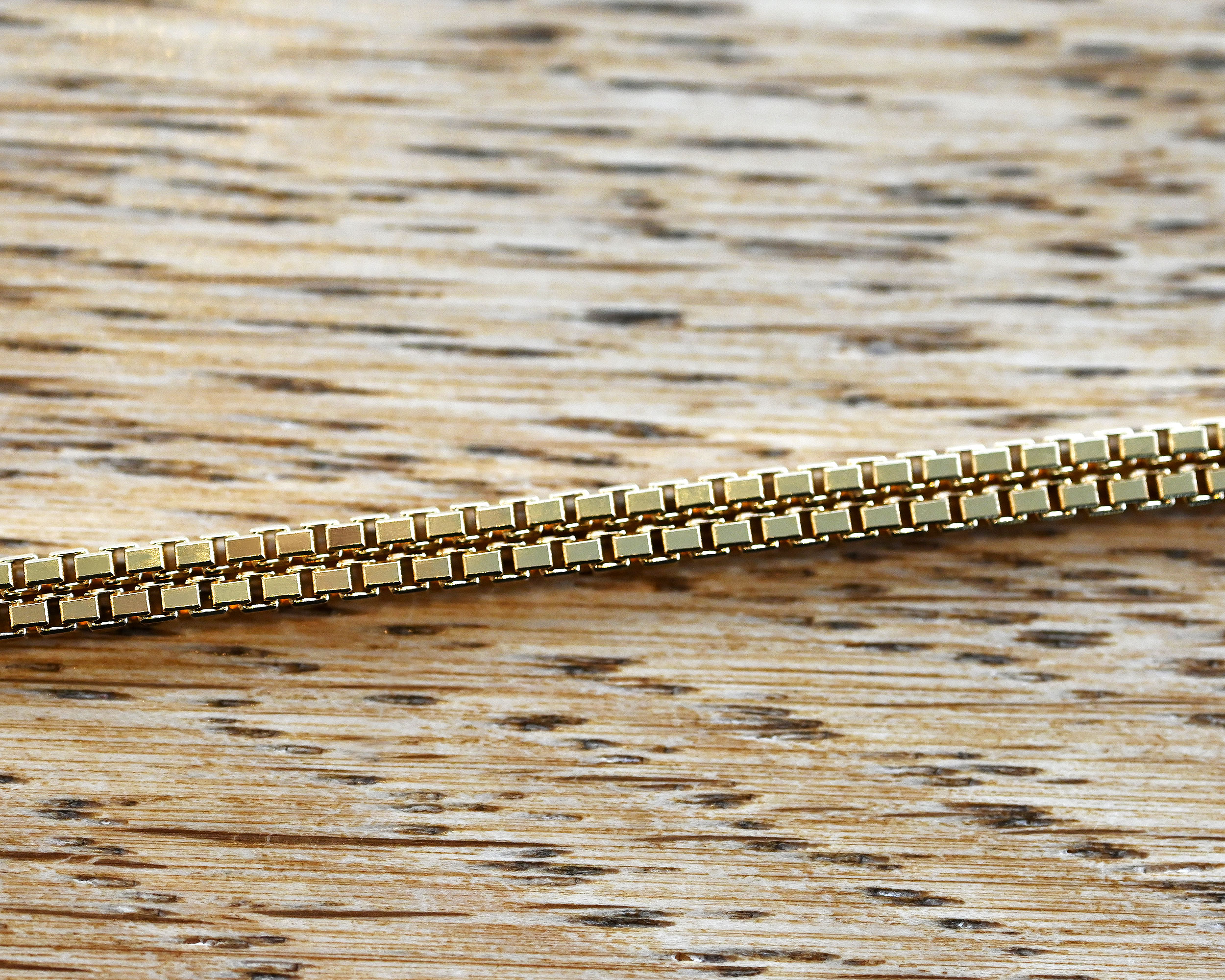 ボックス型のコマを組み合わせたクラシカルなベネチアチェーン。しなやかで密度のあるチェーンは滑らかな光沢と繊細な存在感が魅力。