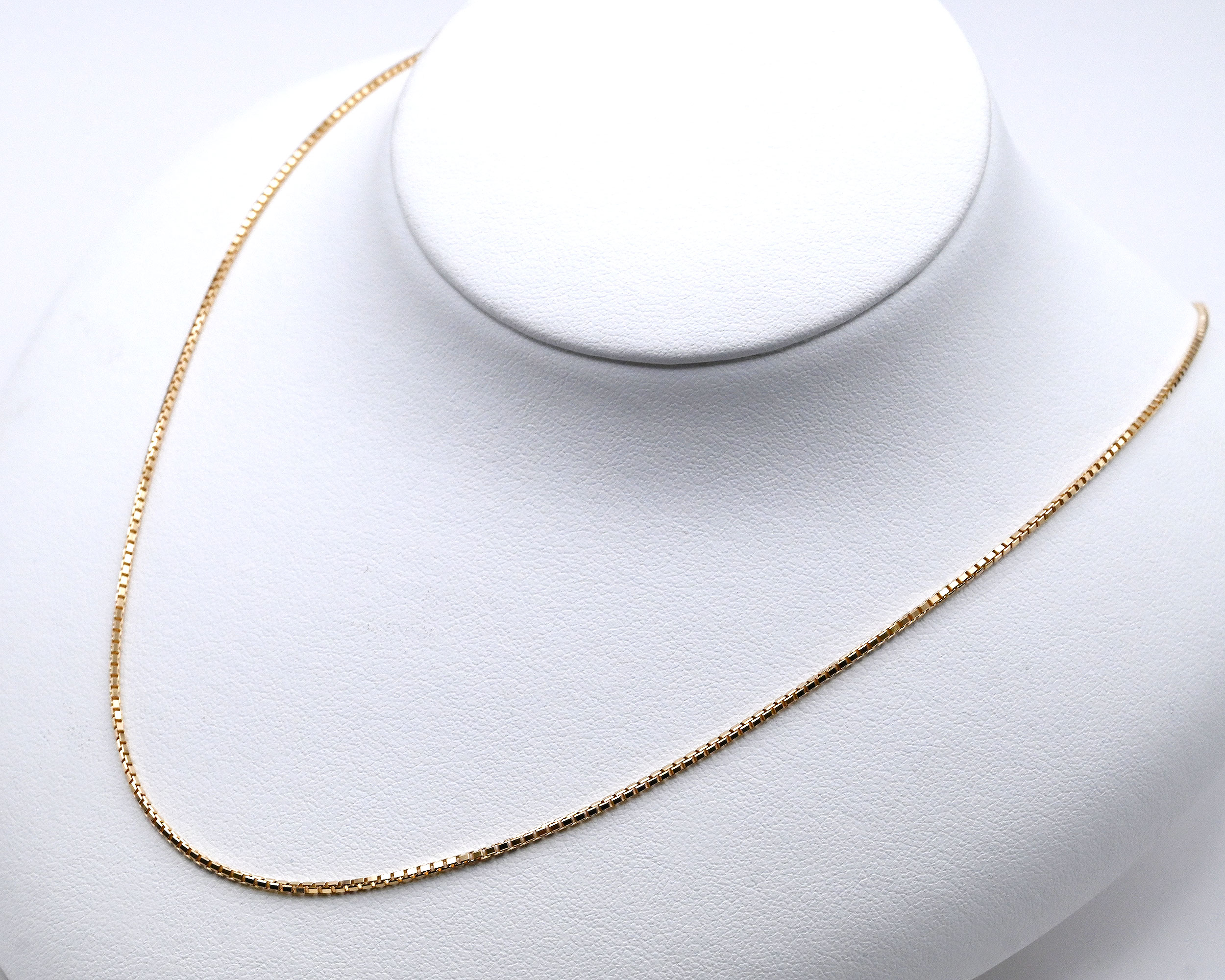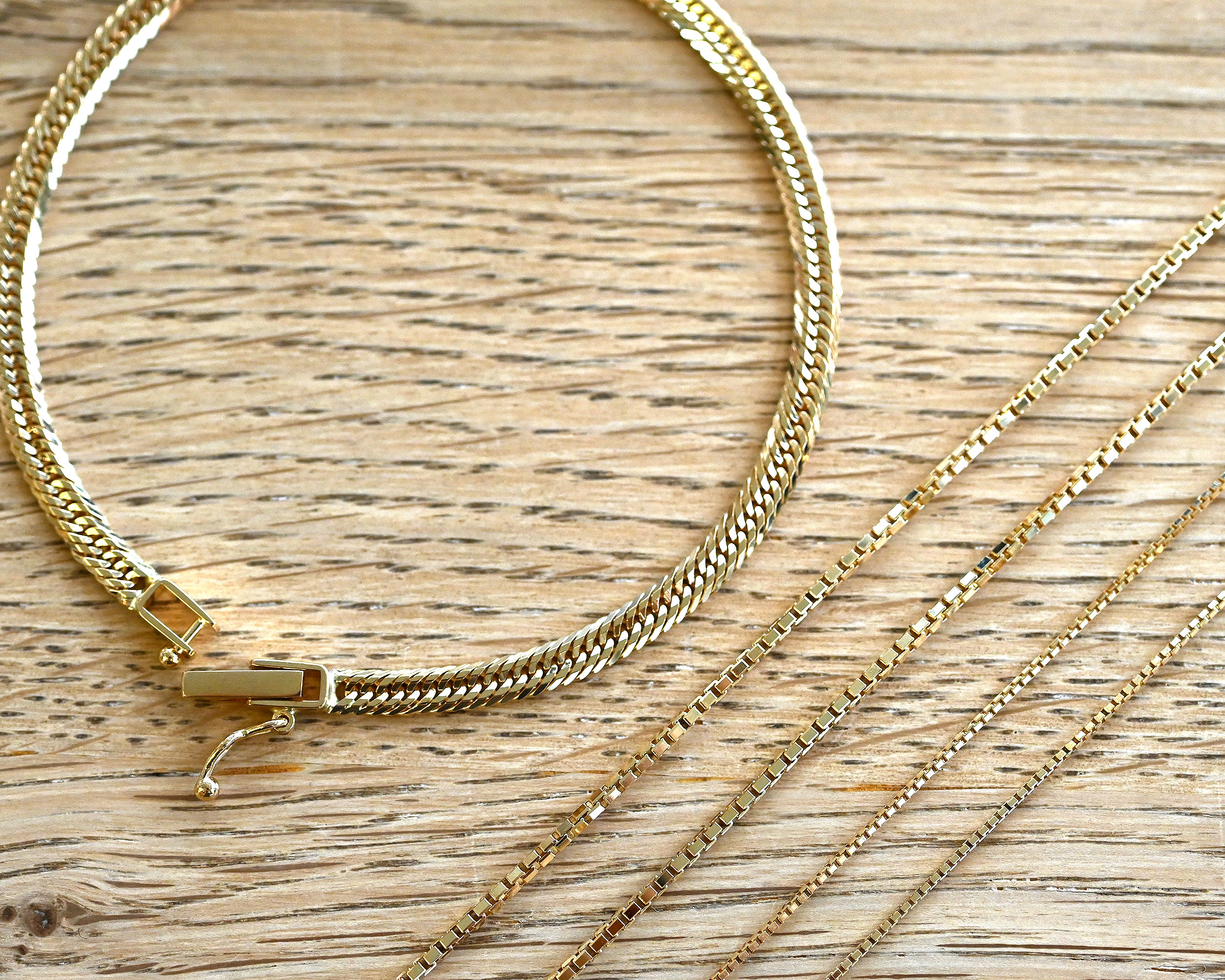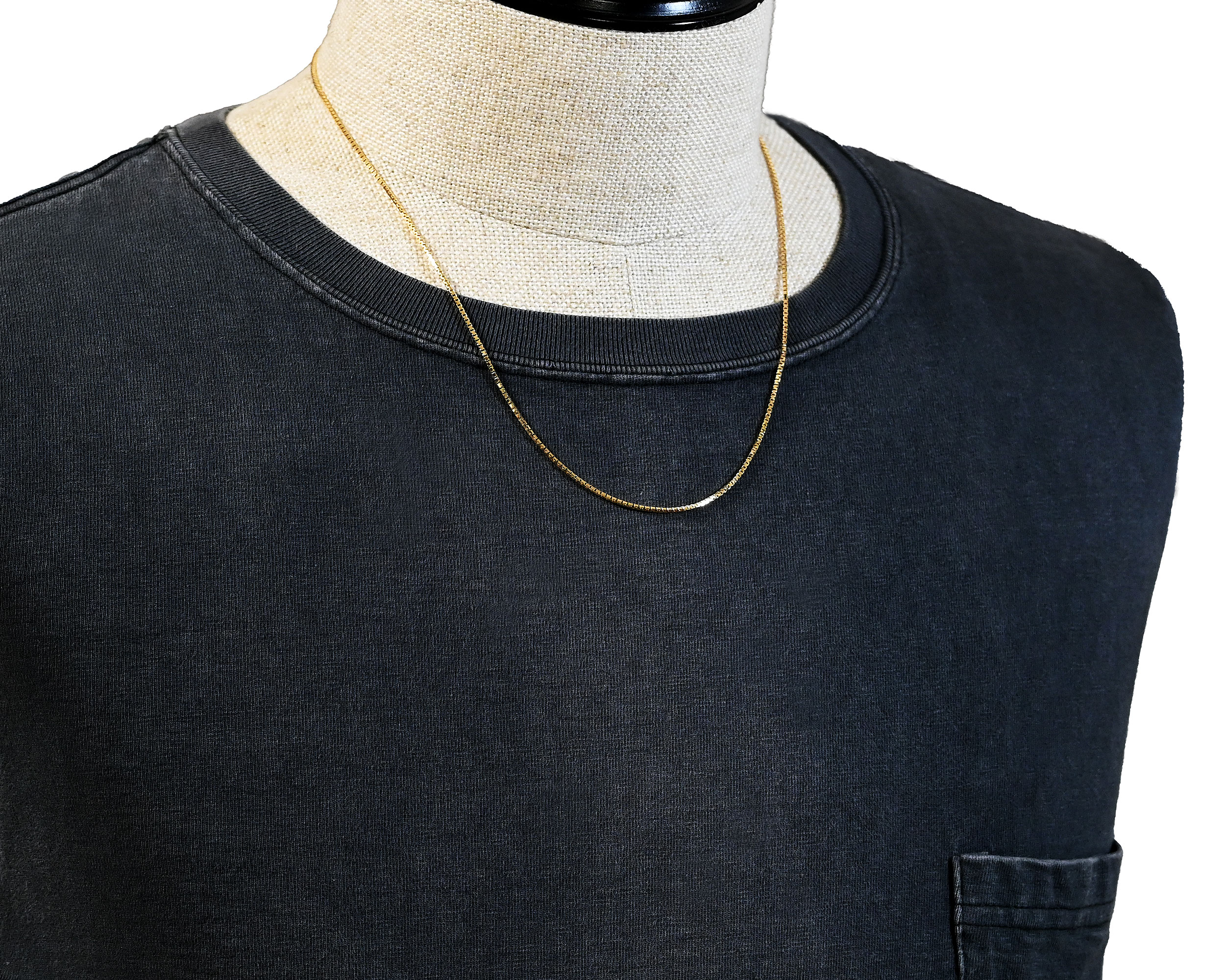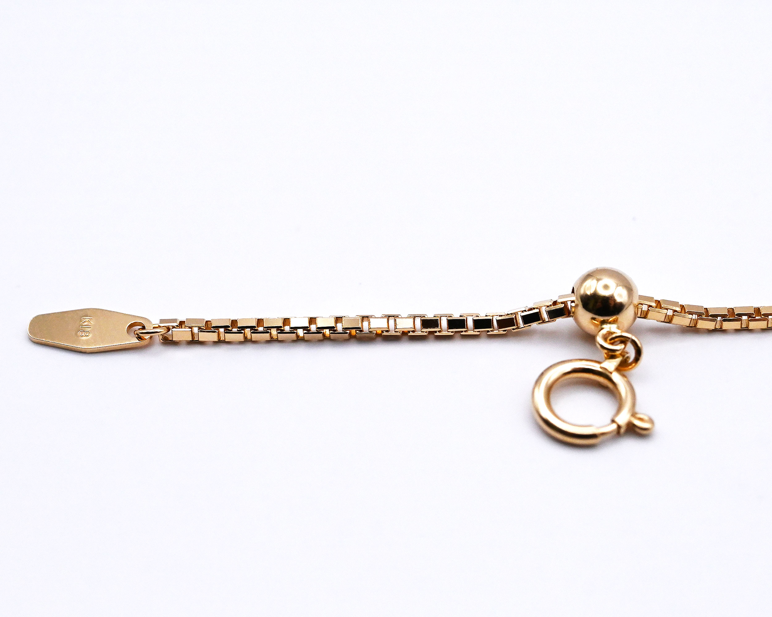 ボックス型のコマを組み合わせたクラシカルなベネチアチェーン。しなやかで密度のあるチェーンは滑らかな光沢と繊細な存在感が魅力。