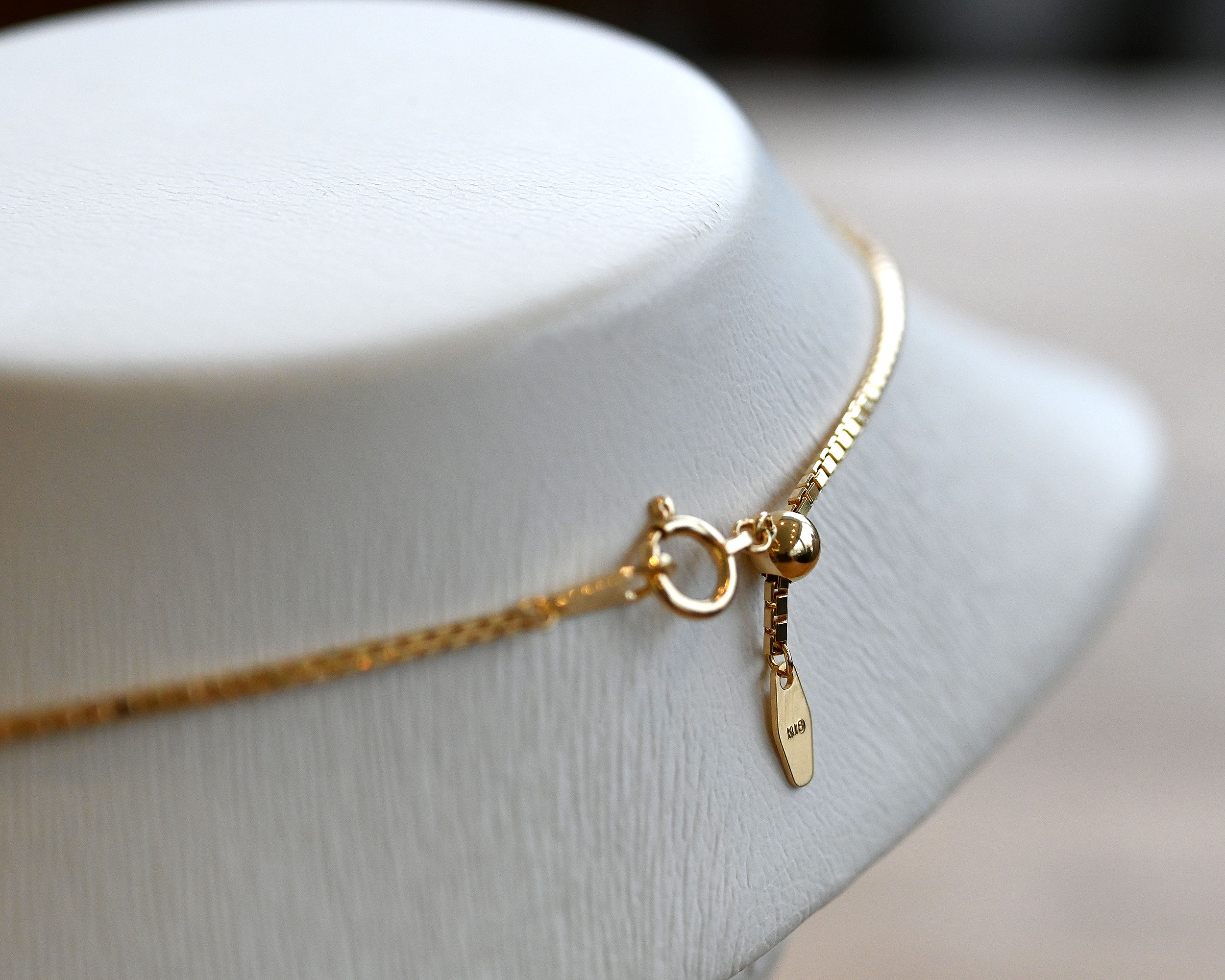 ネックレス単体での着用、ペンダントトップと合わせてもバランス良くお楽しみ頂けます。こちらのネックレスにはスライドアジャスターが付いており、全長50cmよりお好みの長さに短くする事が可能です。