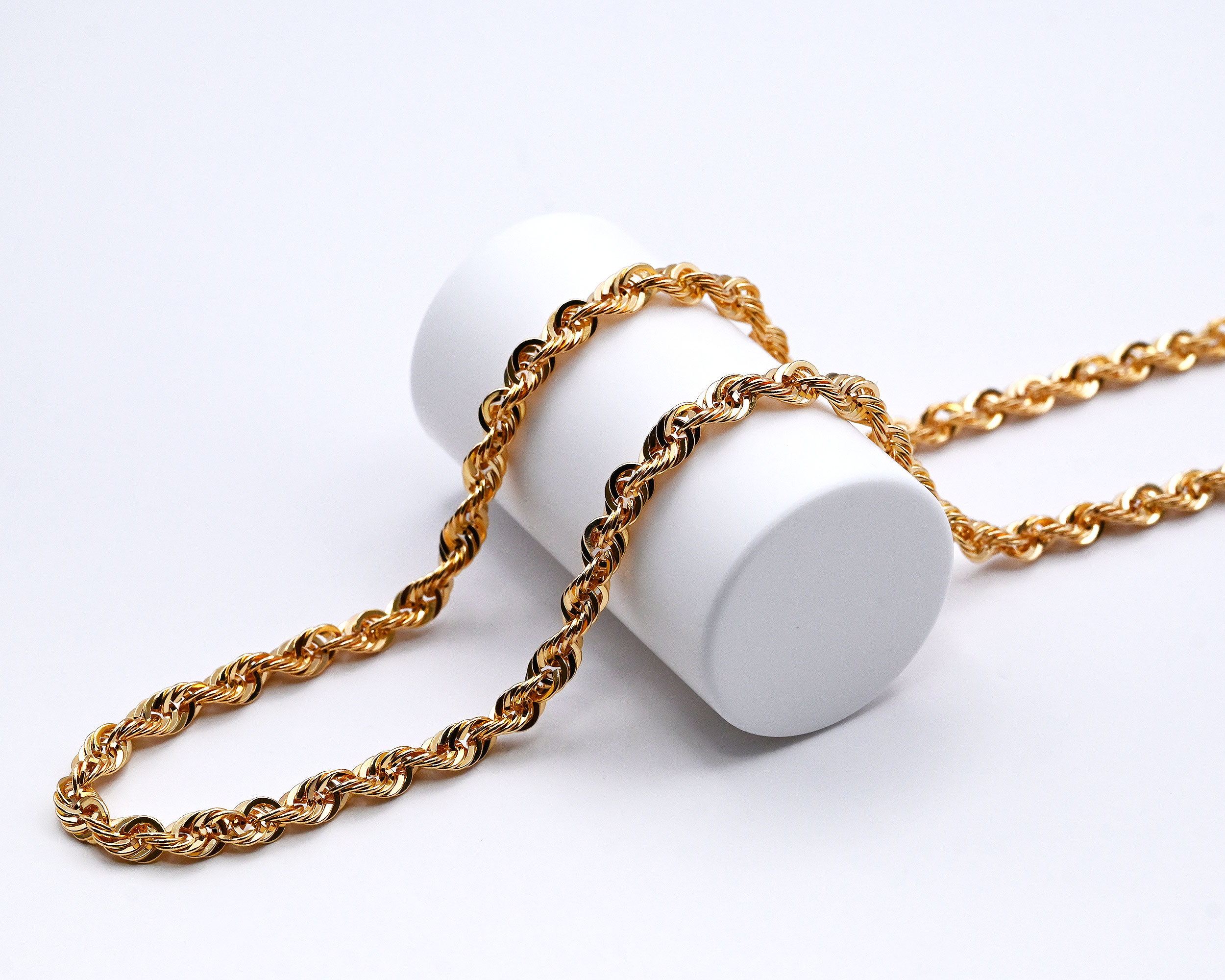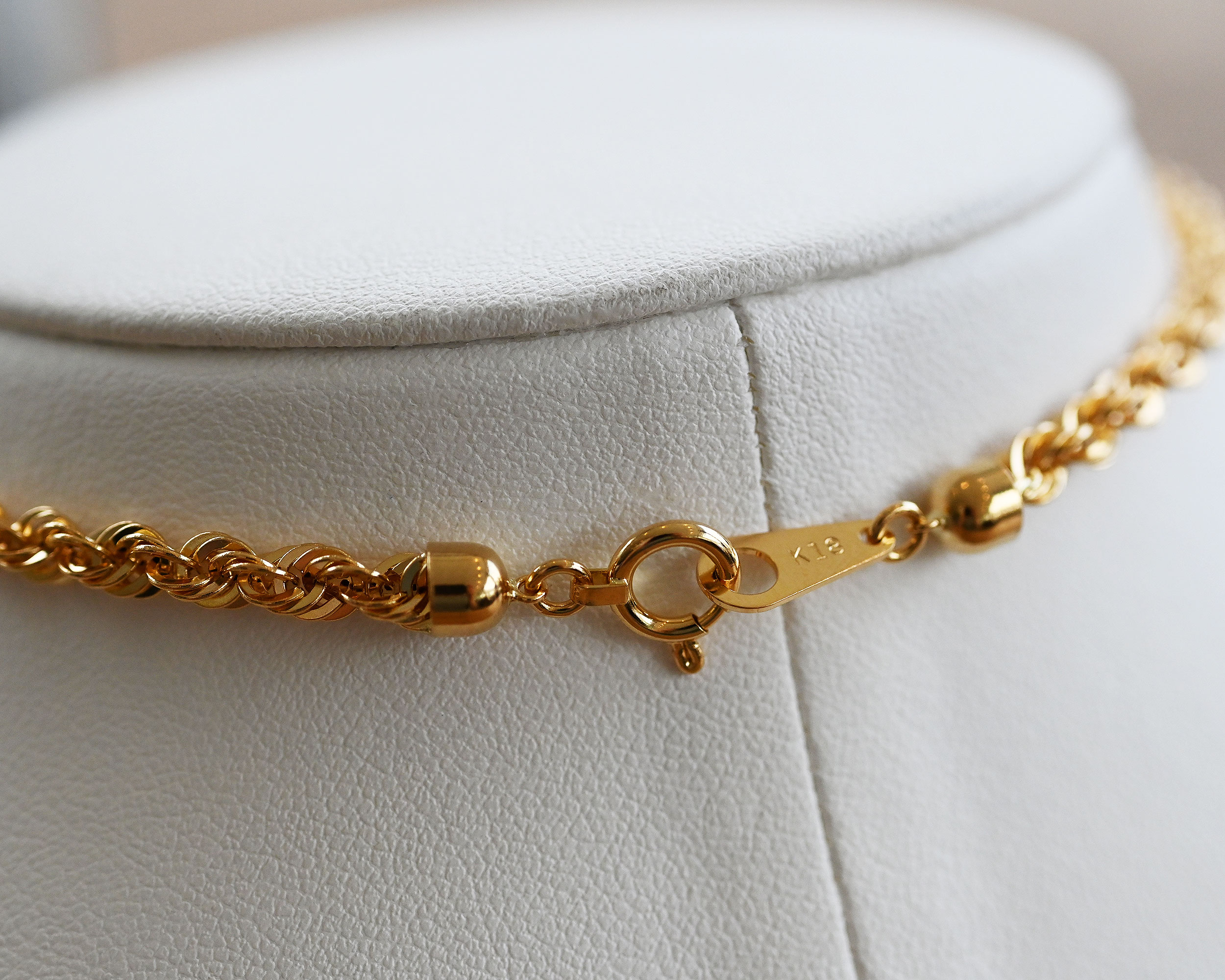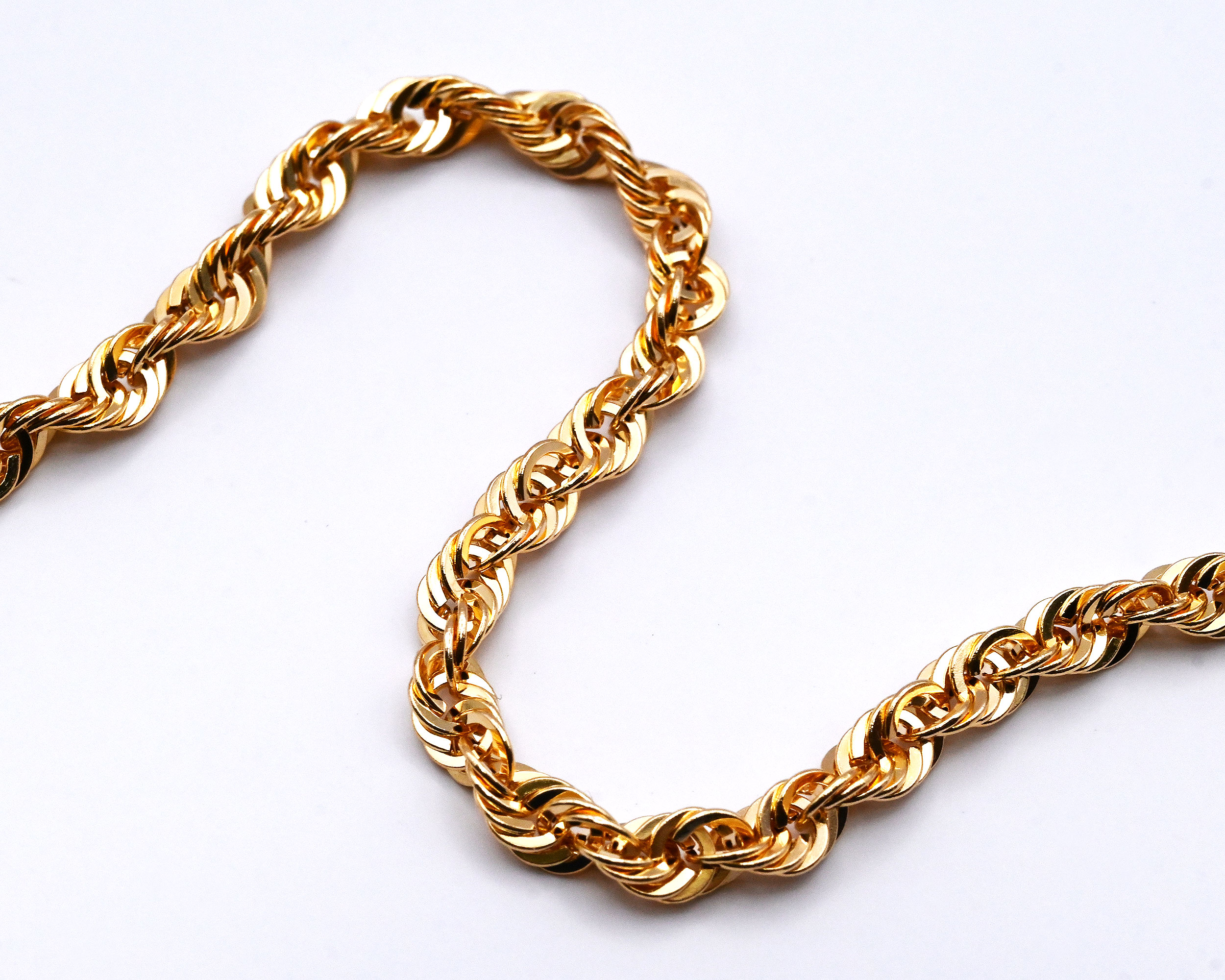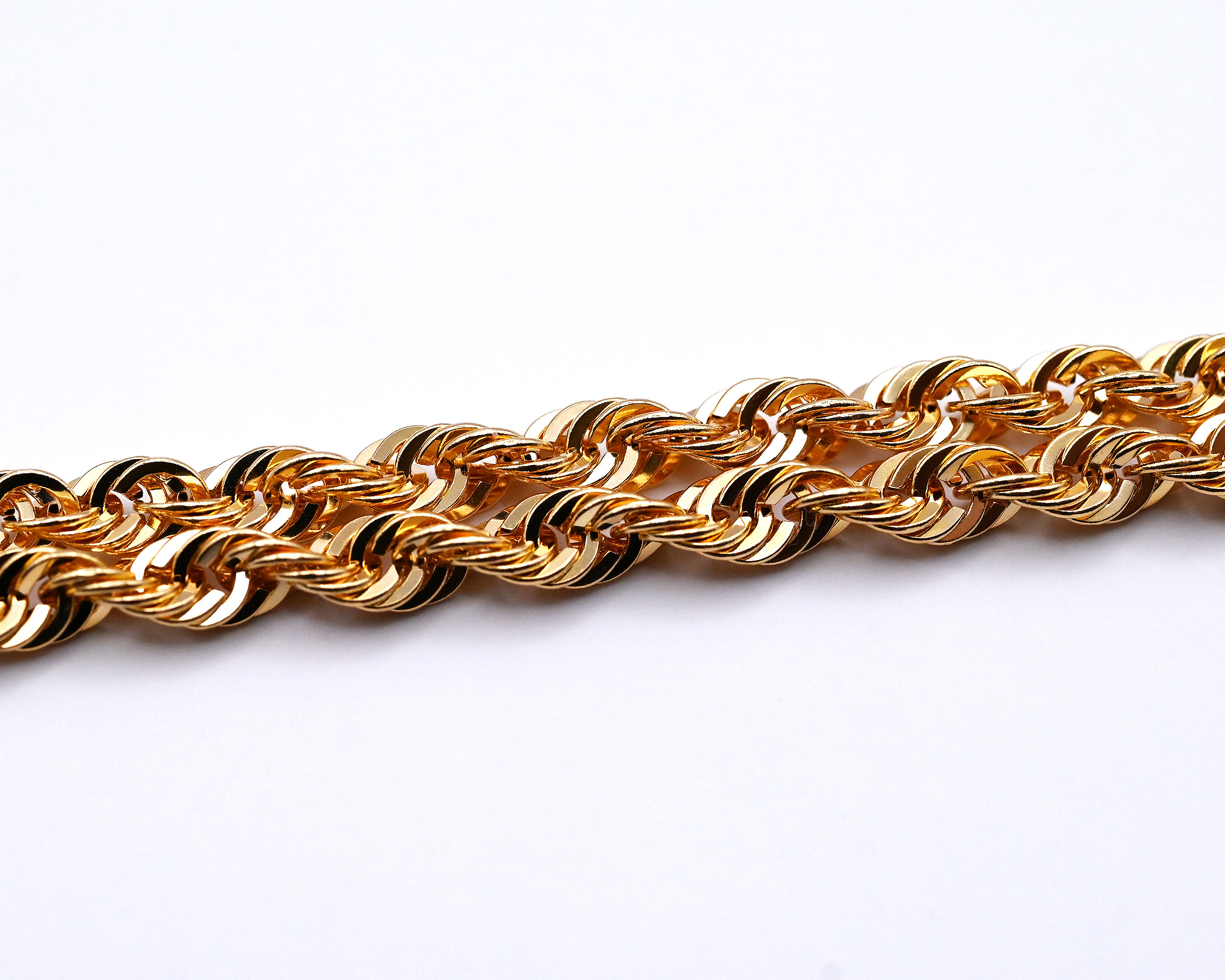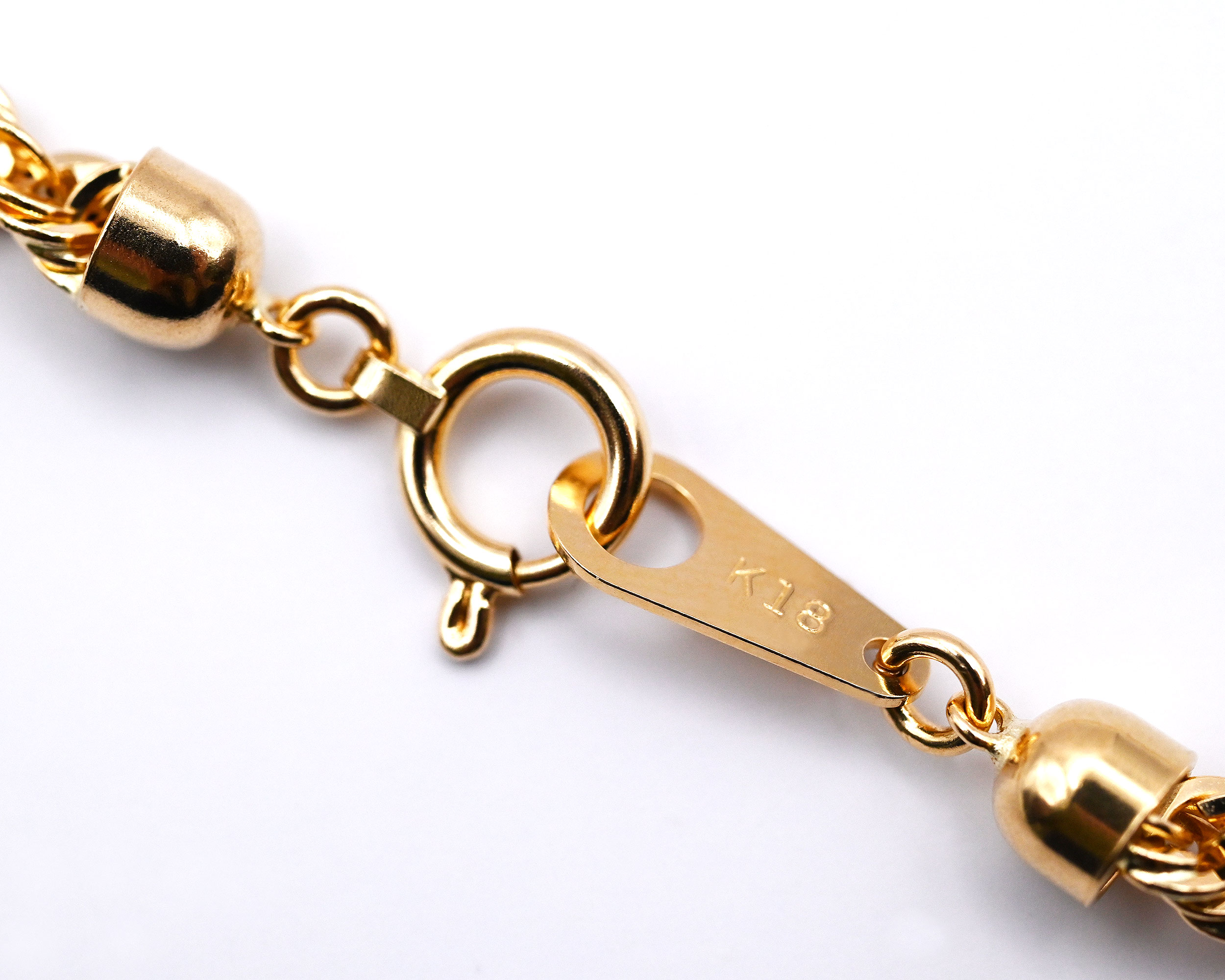 高い作製技術により縄状にデザインされたロープチェーン。入り組んだデザインにより光の反射が良く、K18の輝きを存分にお楽しみ頂けます。